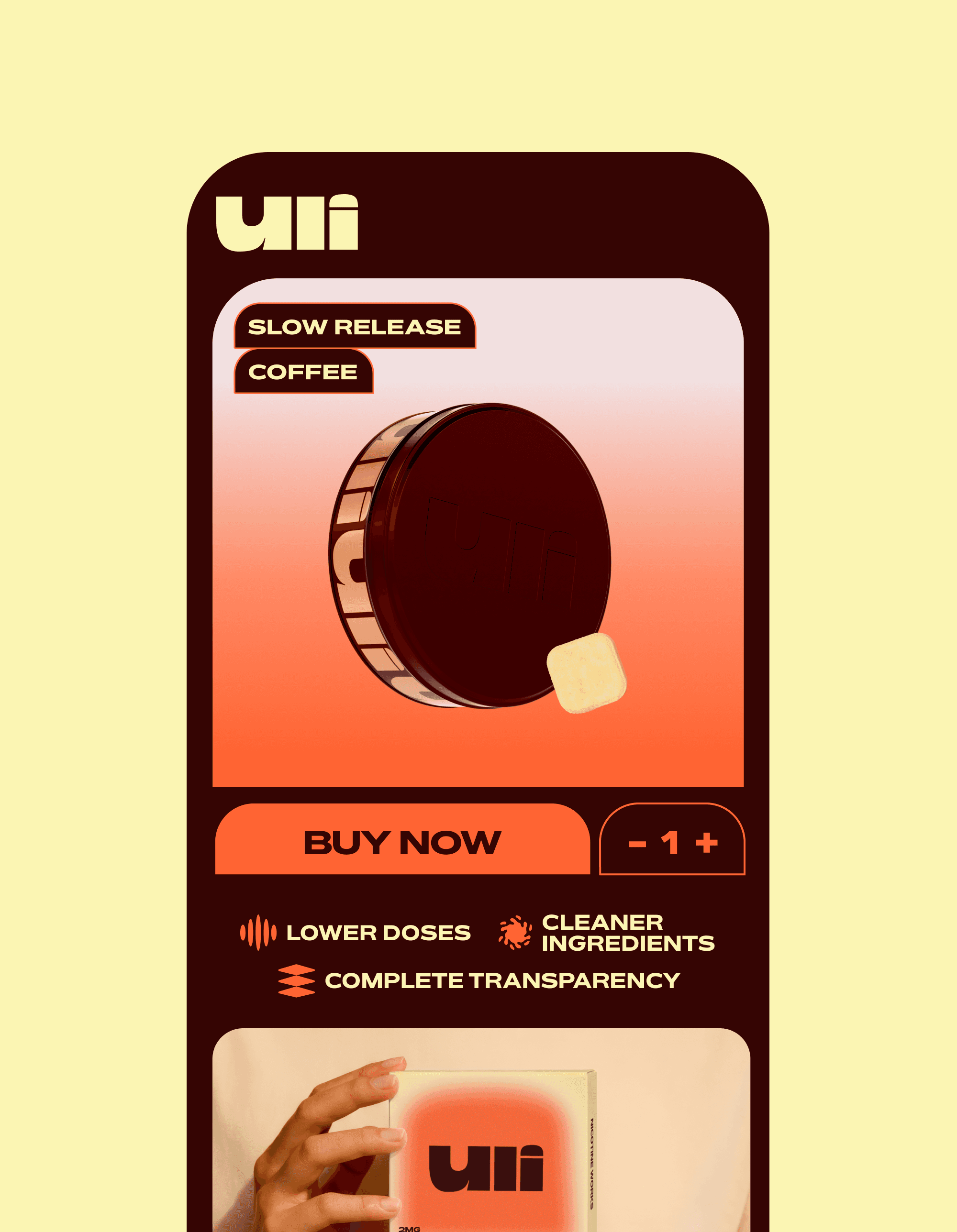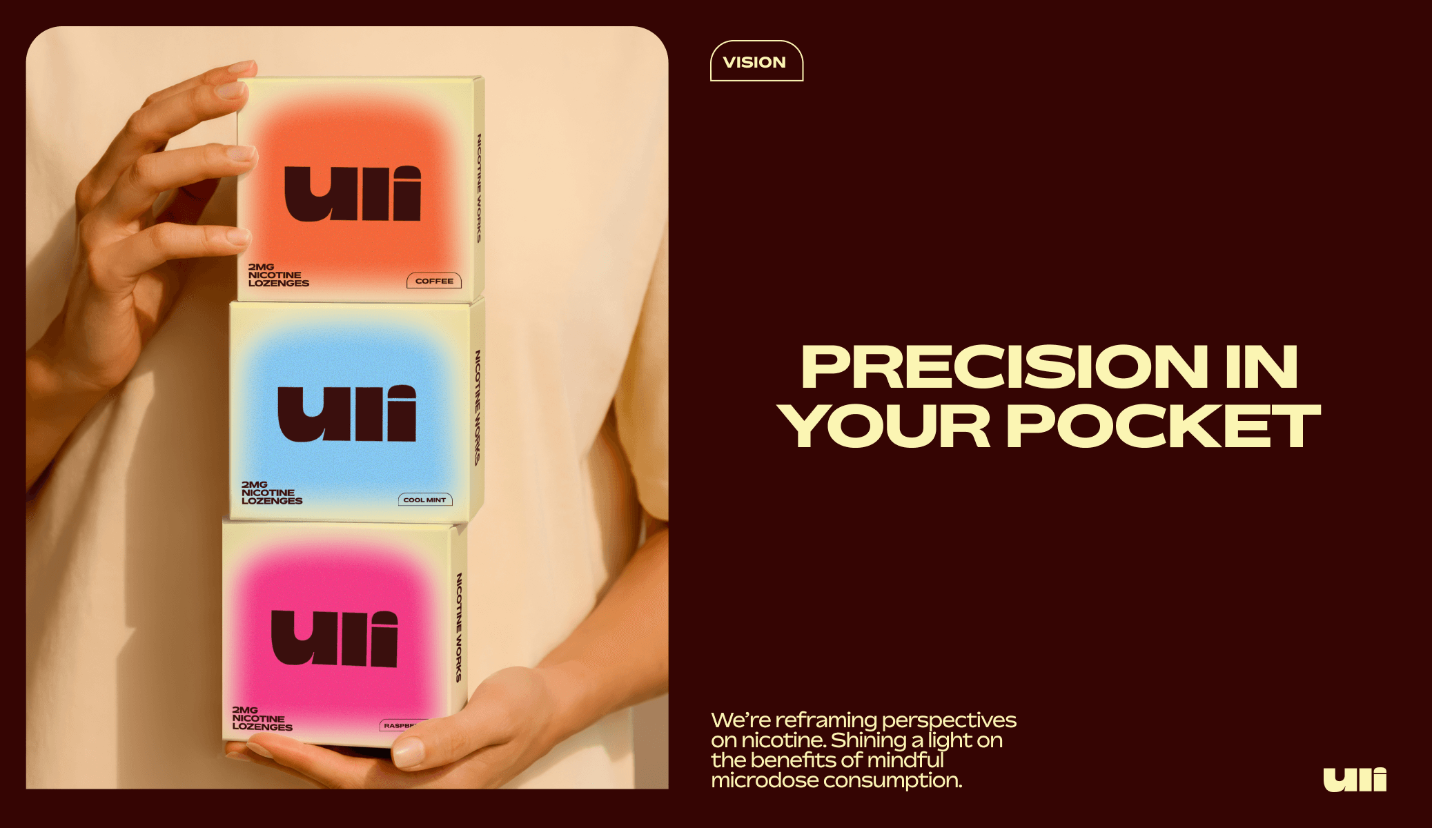 Uli leads the new wave of science-backed nicotine for cognitive enhancement. Reframing nicotine's reputation from habitual to intentional use. In a saturated market dominated by clinical aesthetics and disposable plastic packaging, Uli sets out to create a product you would be proud to have on your desk, attracting bio-hackers and existing nicotine users a like.